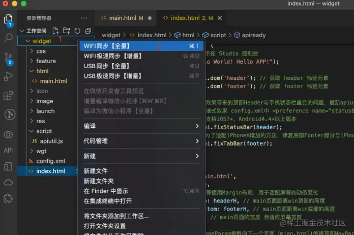 2、鼠标右键点击 widget 文件夹,并选择 WIFI同步(全量) (或者可以直接使用对应的快捷键)