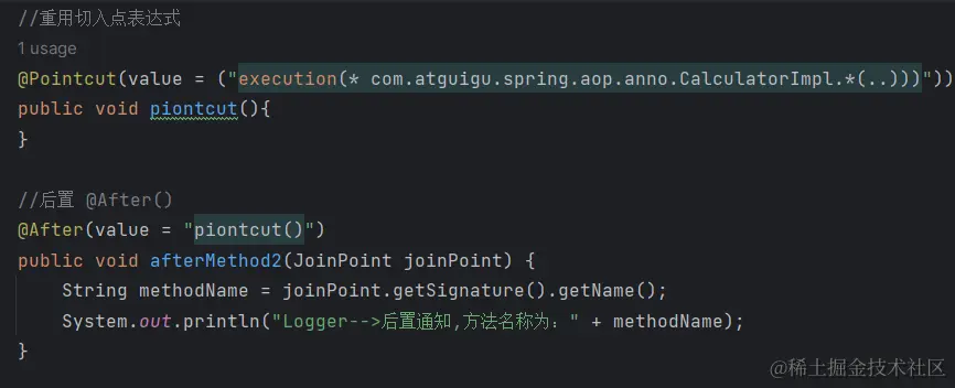 System.out.println("Logger-->后置通知,方法名称为:" + methodName);