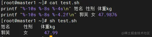 printf "%-10s %-8s %-4s\n" 姓名 性别 体重kg