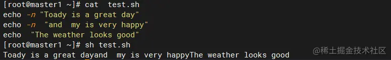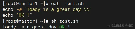 echo命令输出结束后会默认换行,如希望不换行 ,可以\c,表示强制echo命令不换行,因为echo不解析以反斜杠``开头的转义字符,所以\c需要与-e一起使用
