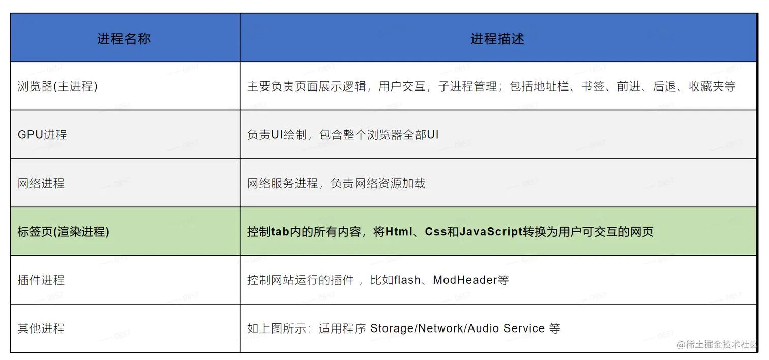 渲染引擎:用来解析 HTML 与 CSS,俗称内核,比如 chrome 的 blink,老版本的 webkit。
