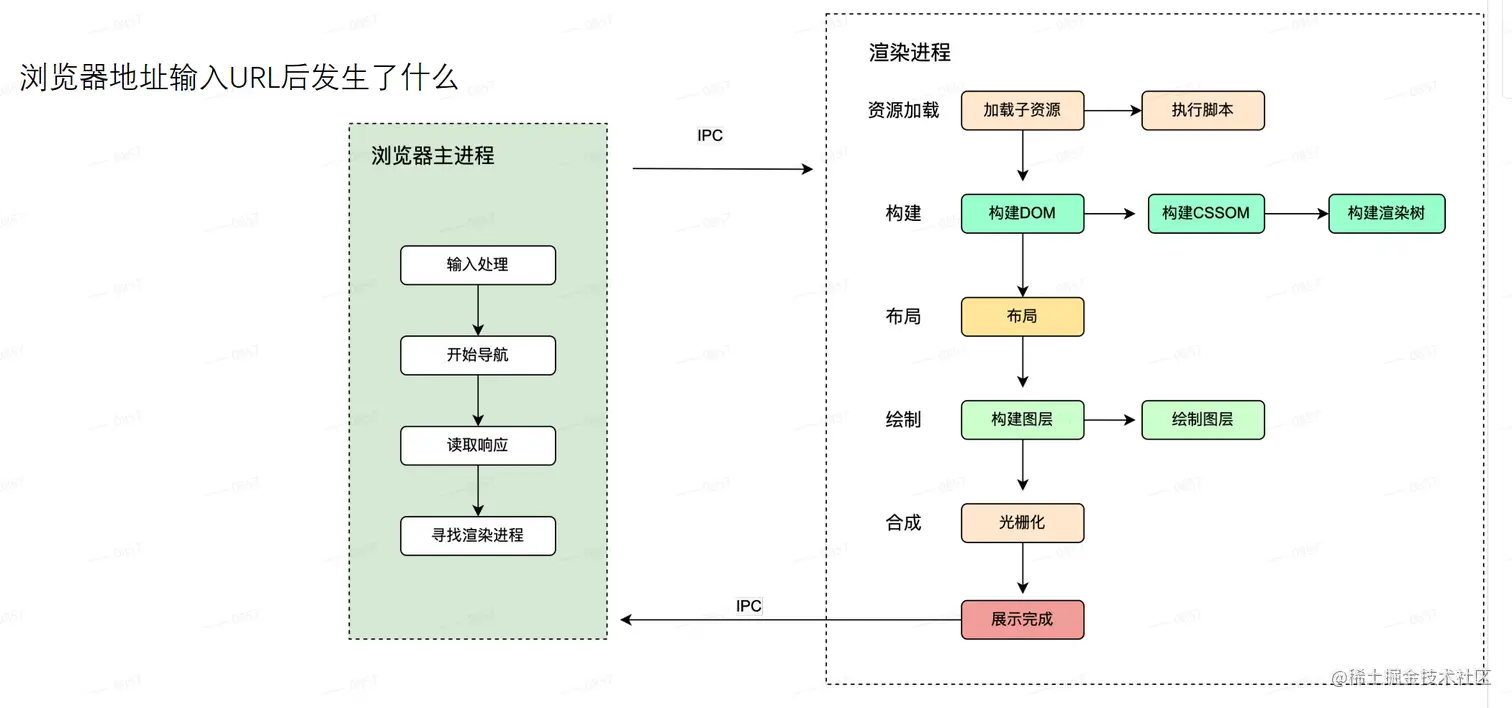 渲染进程对文档进行页面解析和子资源加载。解析html生成DOM树,解析css生成规则树。两个树结合生成渲染树(render tree),浏览器会根据渲染树布局,计算css样式,即每个元素在页面中的位置好和大小等信息。然后为特定的节点生成专用图层。一个图层分成很多绘制指令,然后将这些指令按顺序组成一个绘制列表,交给合成线程。合成线程接收指令生成图块。栅格线程将图块进行栅格化,展示在屏幕上。