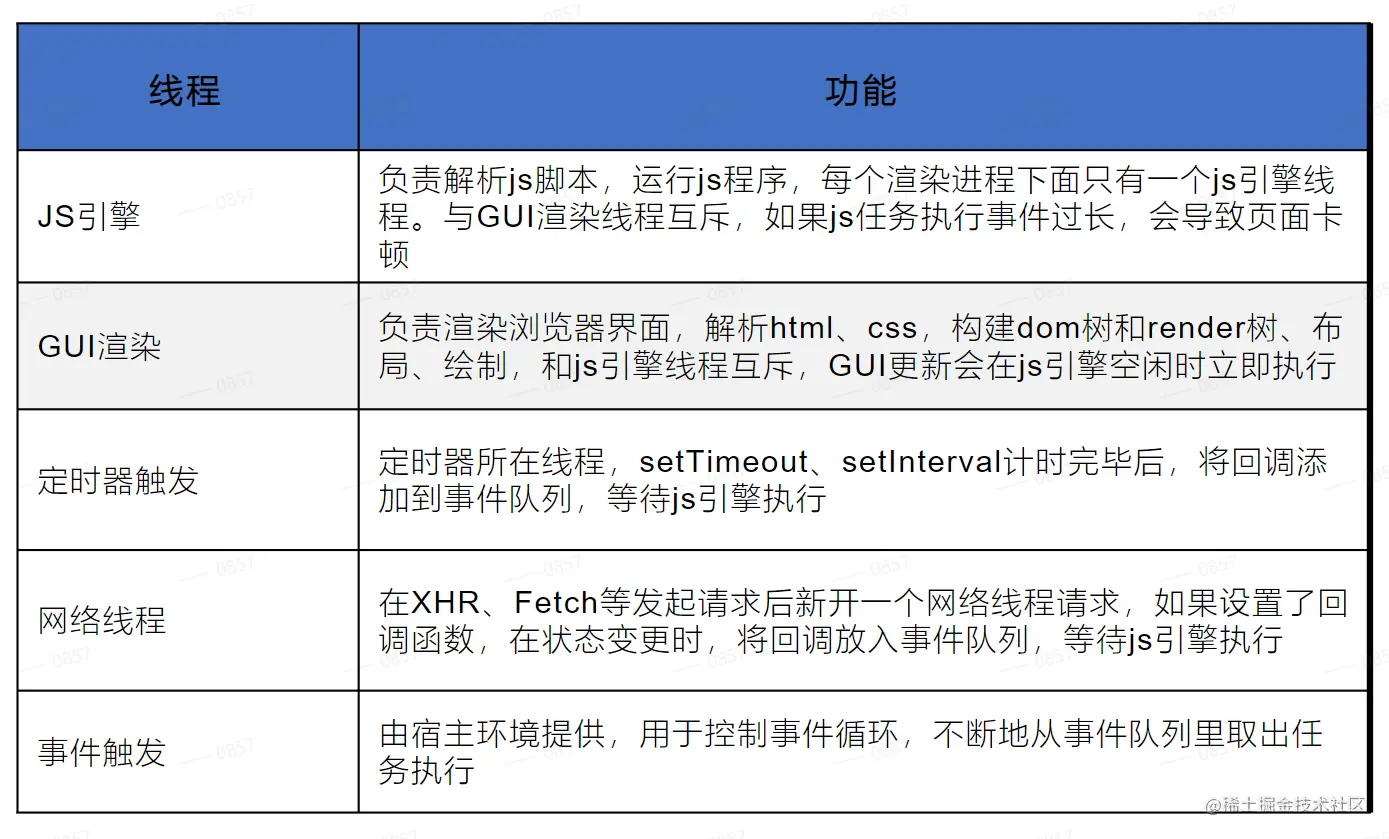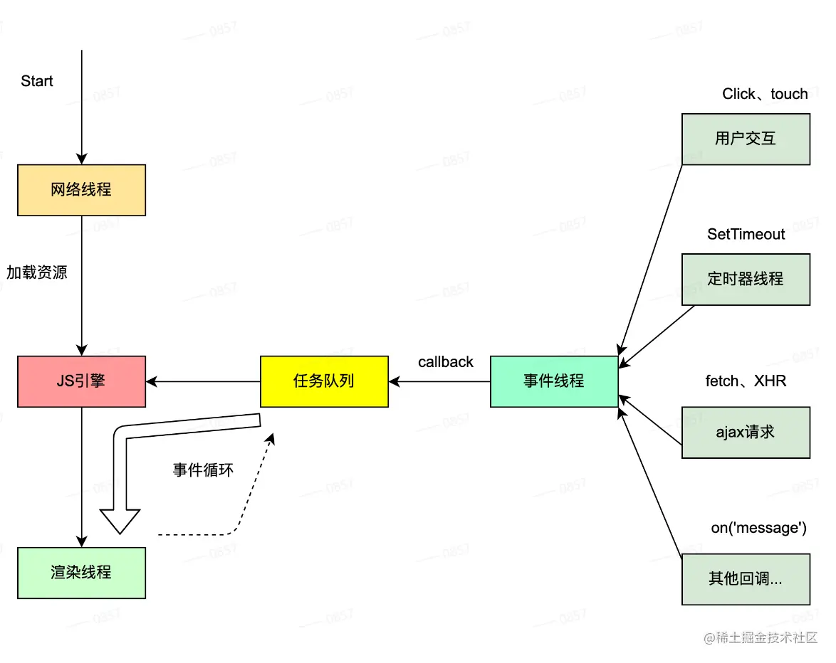 网络线程负责加载网络资源,js引擎解析脚本并执行,js解析引擎空闲时,渲染线程立即工作,用户交互、定时器等产生的回调函数放入任务队列中,事件线程进行事件循环,将队列中的任务交给js引擎执行。其过程如下图所示。