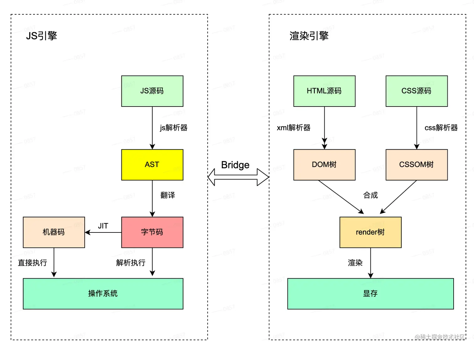 js引擎主要负责解析执行JS,渲染引擎主要负责生成渲染树,两者通过桥接方式通信