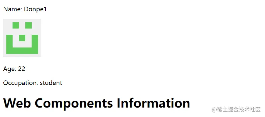 方案:通过使用customElements.define定义自定义组件、属性以及通过元素行为类中的创建DOM元素方法创建对应的组件,最后在页面中使用自定义标签的方式渲染对应的用户信息组件。