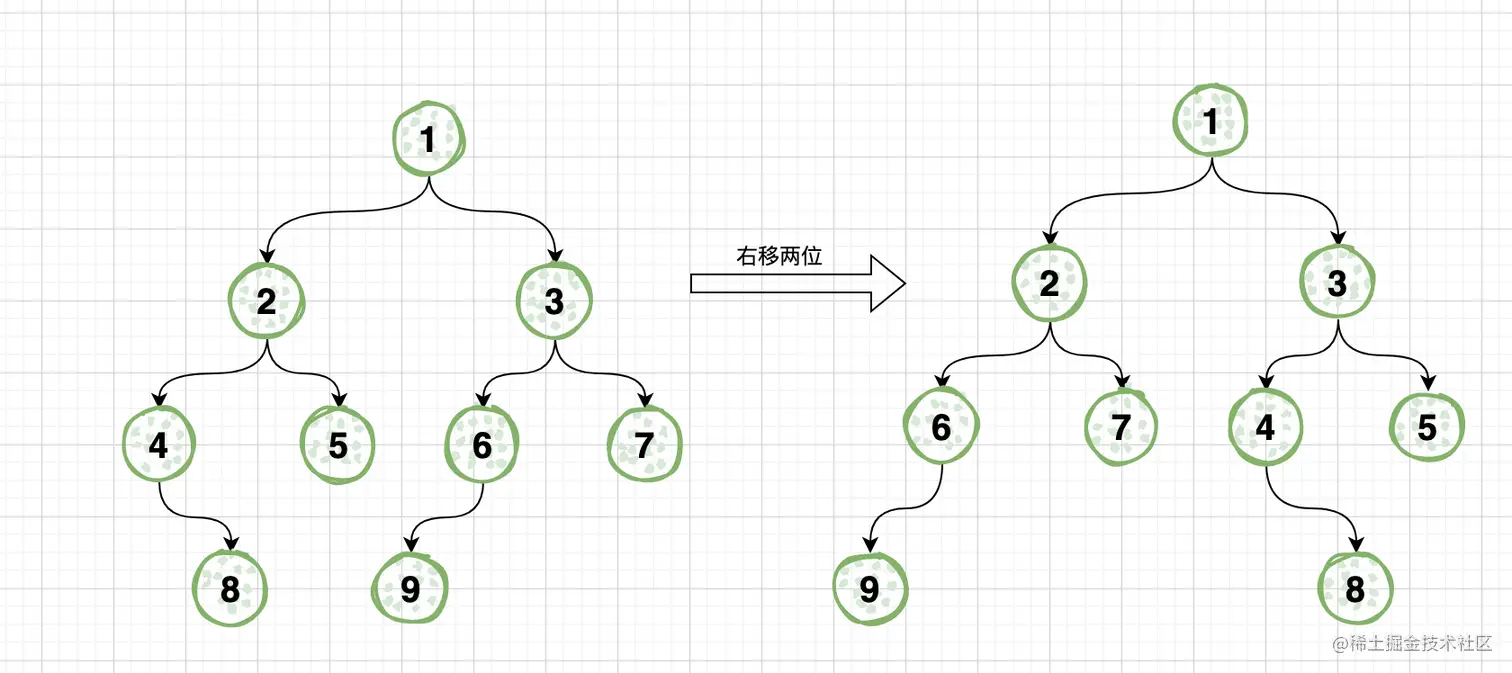 如图所示,将下图中左侧二叉树右移2位后,转换结果为右侧二叉树的结构,每层都水平右移,超出边界则呈循环的形式从左侧再出现。