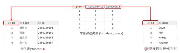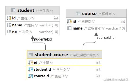 -- 连接条件: student.id = student_course.studentid , course.id =student_course.courseid