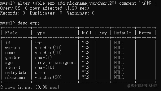 alter table table-name add 字段名 类型 [comment 'XX'];