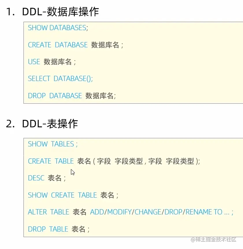 DDL: Data Definition Language, 数据定义语言,用来维护存储数据的结构(数据库,表),代表指 令:create, drop, alter等。