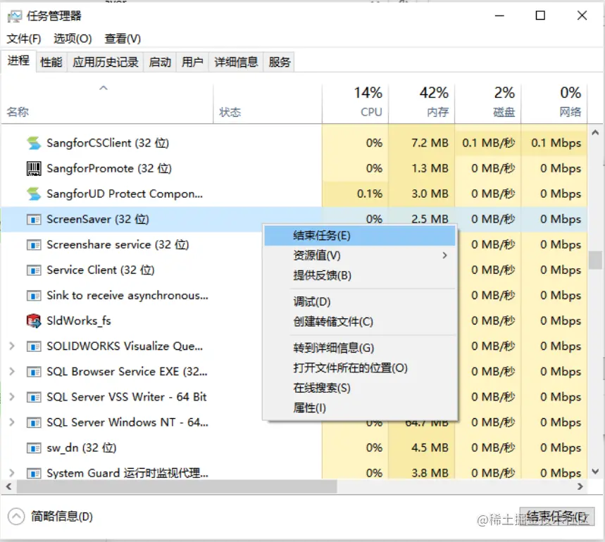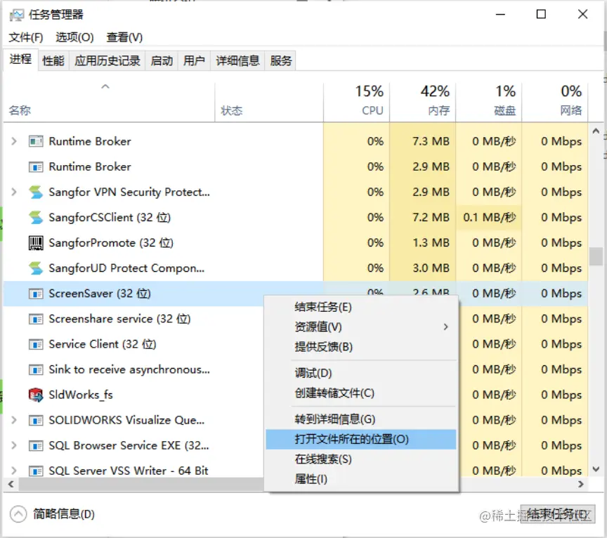 1、如果是在屏保期间出现弹窗广告,出现弹出广告后,打开“任务管理器”,查找ScreenSaver这个进程,然后鼠标右键点击“打开文件所在的位置”,去查找屏保后启动的程序。