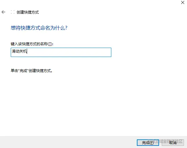 点击下一步,给这个快捷方式取一个名字即可,比如我这里取“滑动关机”