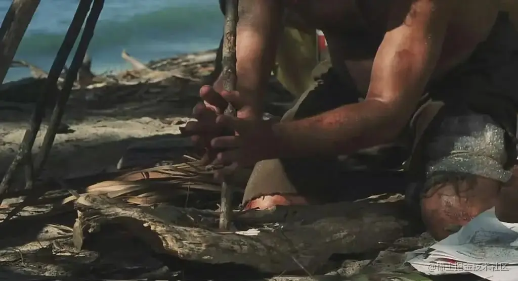 没有生火工具,没有办法,他只能用最原始的方法,钻木取火...