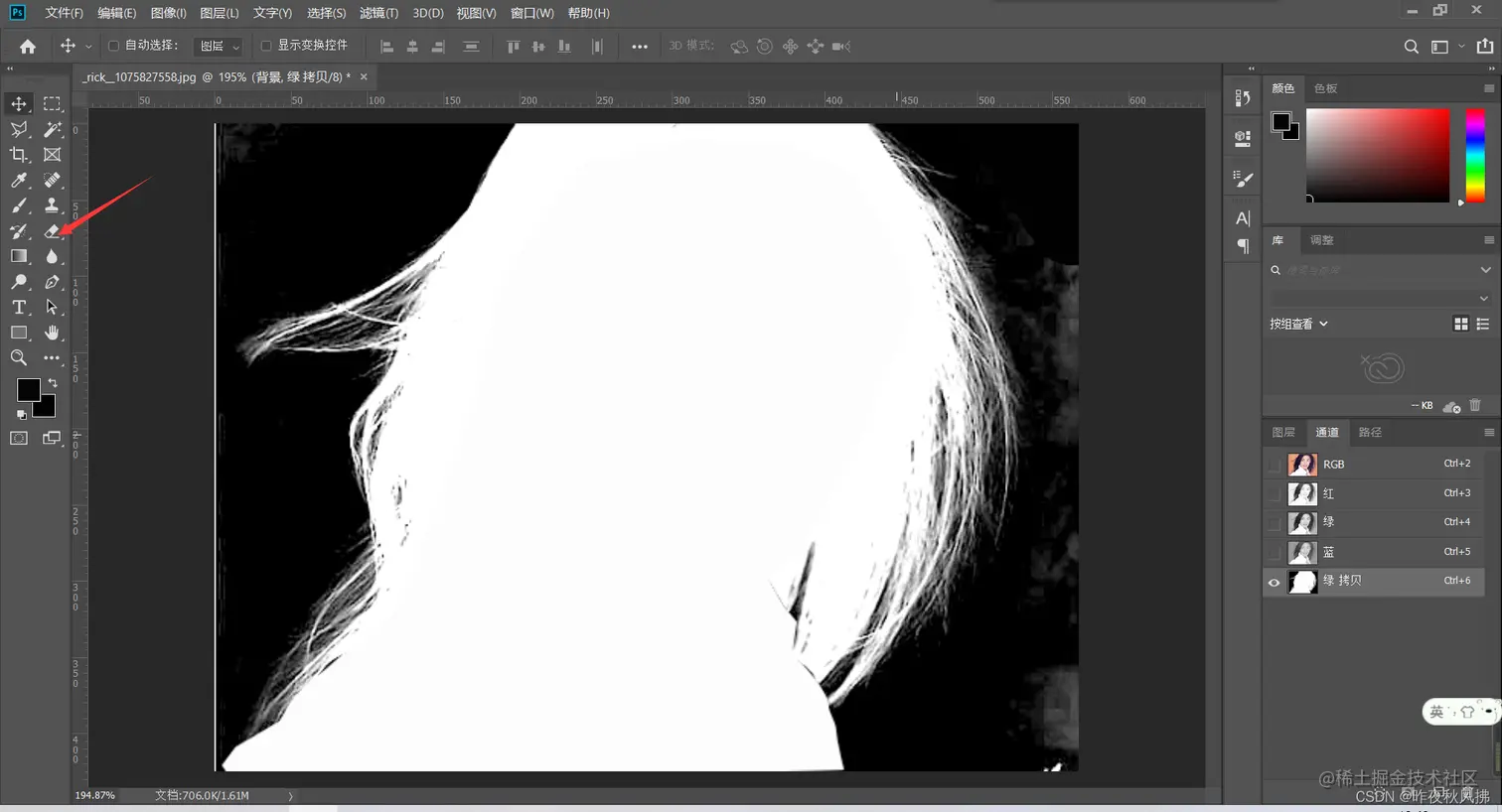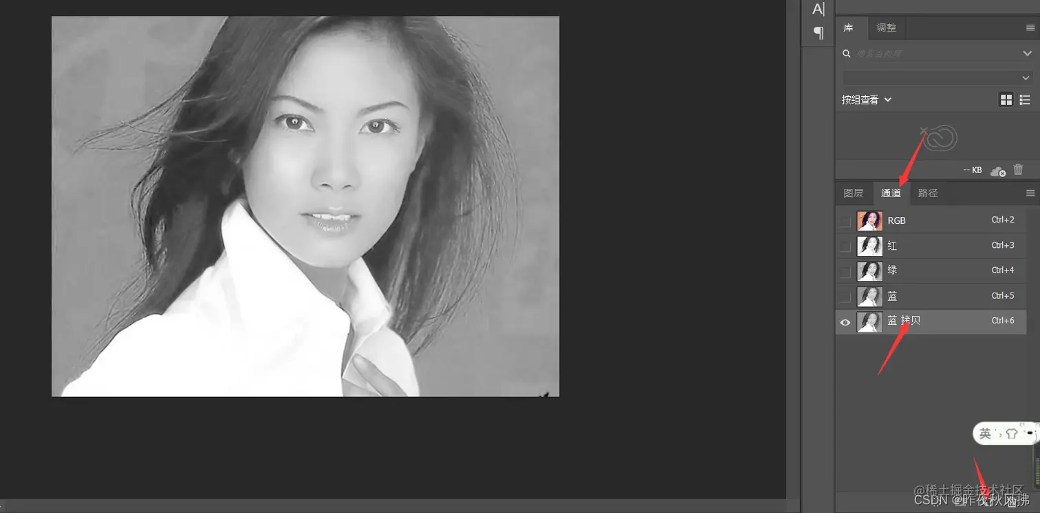 第三部:点击通道,除RGB颜色外任选一个黑白对比度高的颜色鼠标点击拖动到最下方复制一份