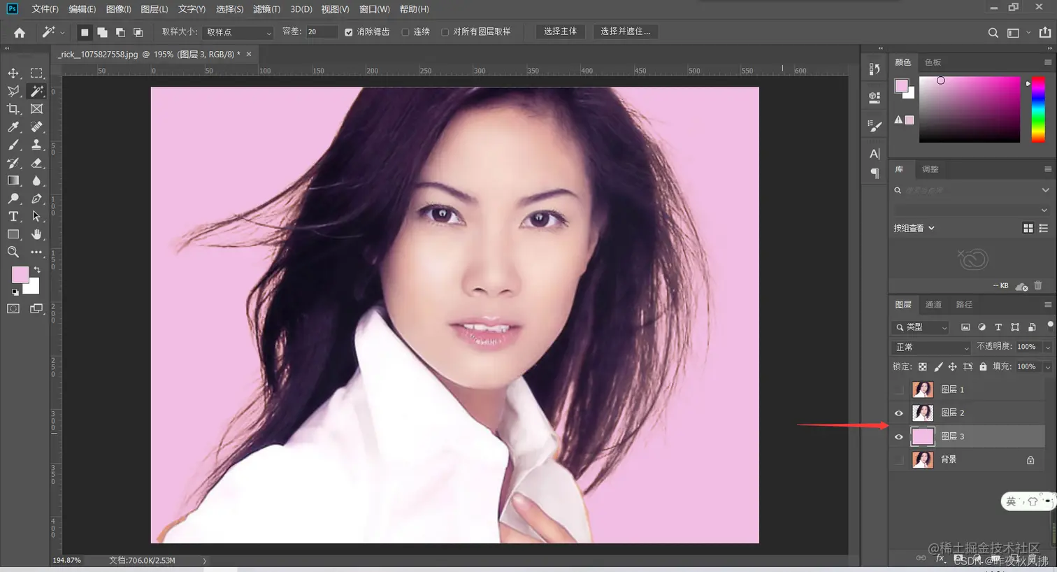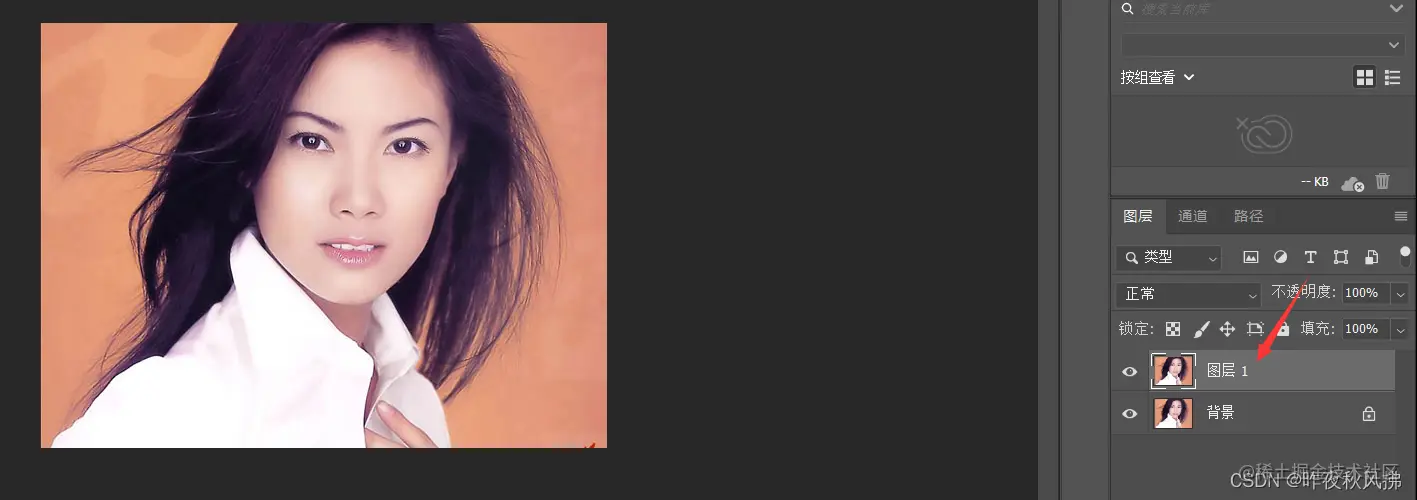 第八步:按住ctrl+j可单独把人物复制出来,再创建新图层随便填充一下背景色,将复制出来的人物置于刚创建的图层之上,便可看到人物与背景分离,最终完成抠头发丝的工作