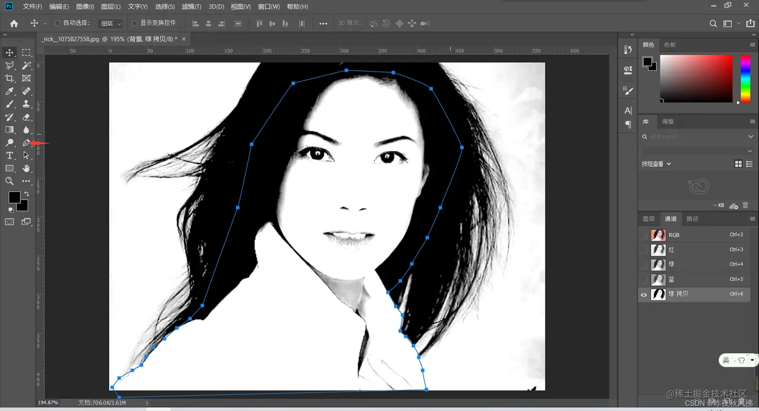 第四步:选择钢笔工具,把人物除头发外的身体部分全部勾画出来形成选区,并且在选区内填充黑色