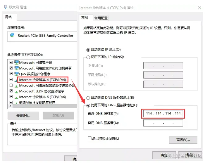 4、点击”TCP/IPv4协议“,在【使用下面的DNS服务器地址】内填写进”114.114.114.114“或”114.114.115.115“IP地址。