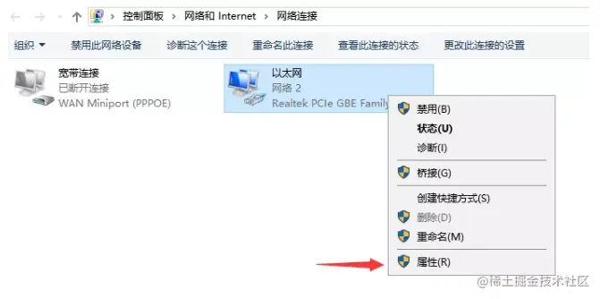 3、接着右键点击断开的网络,选择属性。