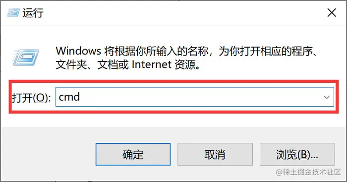 步骤2: 在【运行】界面的输入框中,输入【cmd】,接着点击【确定】按钮,打开【管理员命令窗口】。