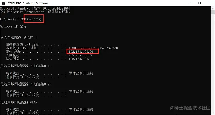 步骤3: 在【管理员命令窗口】中,输入ipconfig,接着在键盘上按下回车键,等待片刻后,就可以看到电脑的IP地址。