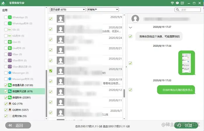 步骤二: 扫描结束,点击左侧的“微信聊天记录”,将显示出来的数据中,找到删除好友的聊天记录,勾选完后就可以点击“恢复”啦!