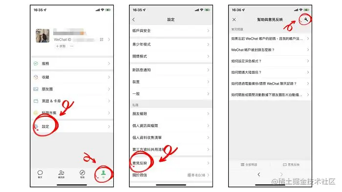 第一步: 将手机中的微信打开,点击【我】,再点击【设置】,然后点击【意见反馈】,最后点击【工具】即右上角的扳手图案。
