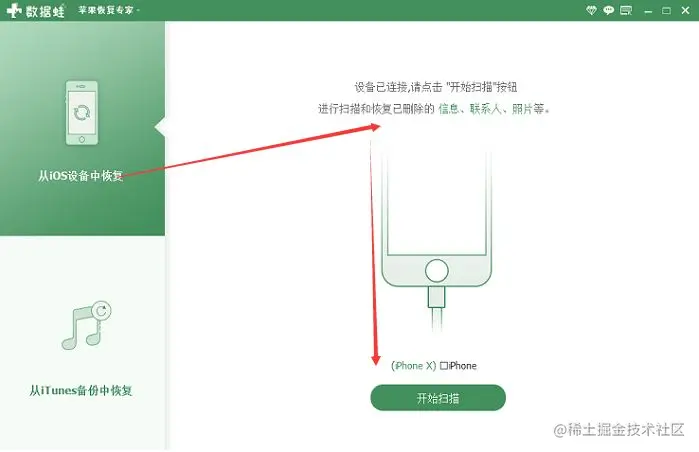步骤一: 安装软件,安装完后,打开软件并连接手机,点击“开始扫描”即可。