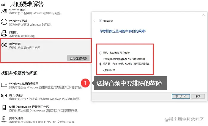 - 选择无法播放声音的设备 ,并依据提示进行即可。