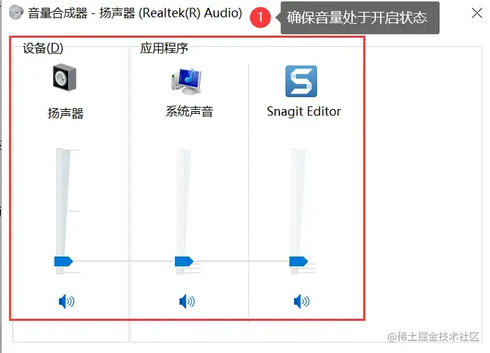 3.确保 【设备】 和 【应用程序】 音量都处于开启状态。