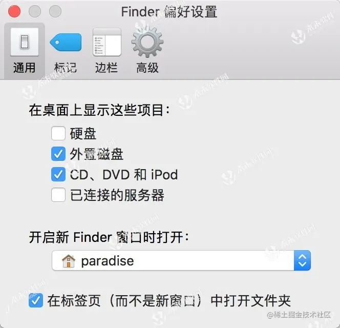 在通用菜单中,可以设置开启新 Finder 窗口时显示的文件夹