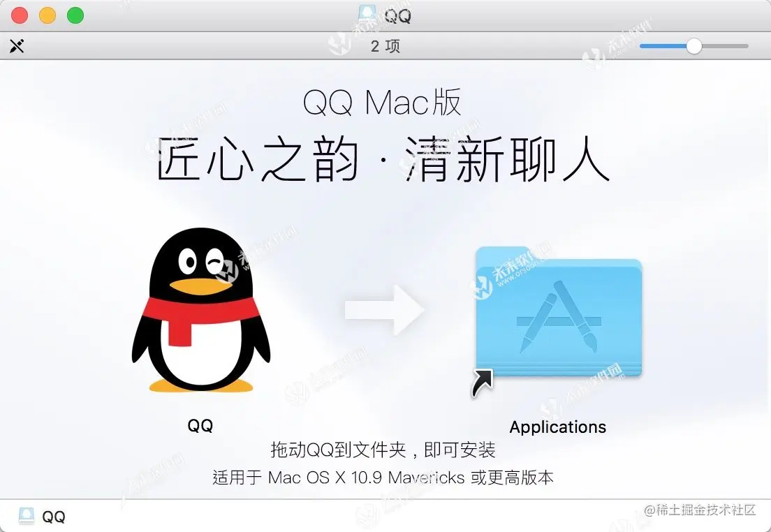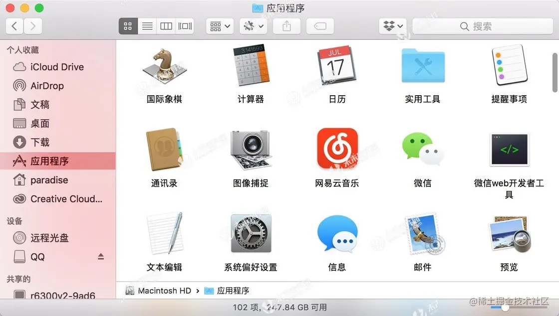 另外一种是从网站下载应用,下载下来的一种是可以直接运行的应用,另外一种是 dmg 格式的文件。dmg 是一个磁盘映像的文件格式,类似于 Windows 下的 iso 文件,安装程序的 dmg 文件双击就可以打开,里面会包含可以运行的应用和应用程序文件夹。不管下载下来的是哪种类型的文件,只要将应用拖入到应用程序文件夹,就完成了安装。