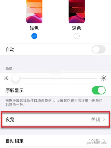 当手机自动切换到夜览模式时,屏幕会突然变暗。这种情况,只要进入iPhone的设置 - 显示与亮度,将“夜览”选项关闭即可。