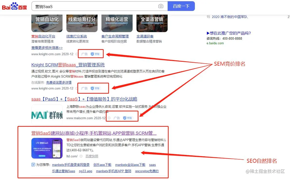 这里要区分一下,我们在搜索引擎中搜索某一个关键词时出来的结果主要是由SEM竞价排名和SEO自然排名两个部分组成。