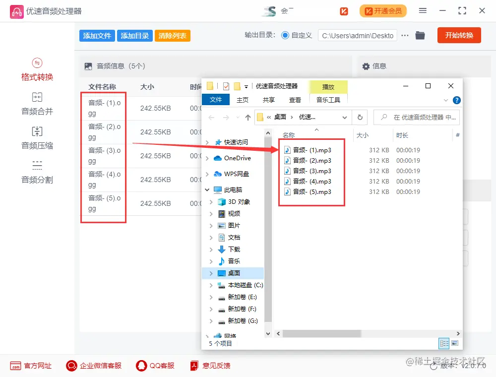 步骤4,稍等一小会,当所有ogg音频完成格式转换后软件会打开输出文件夹,可以看到所有ogg音频文件全部转换为mp3格式了。