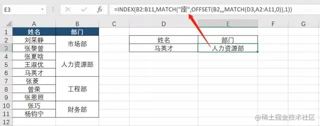 遇到有合并单元格的,可以输入公式=INDEX(B2:B11,MATCH("座",OFFSET(B2,,,MATCH(D3,A2:A11,0)),1))