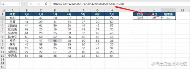 在单元格中输入公式=INDEX(B2:H12,MATCH(J2,A2:A12,0),MATCH(K2,B1:H1,0))。