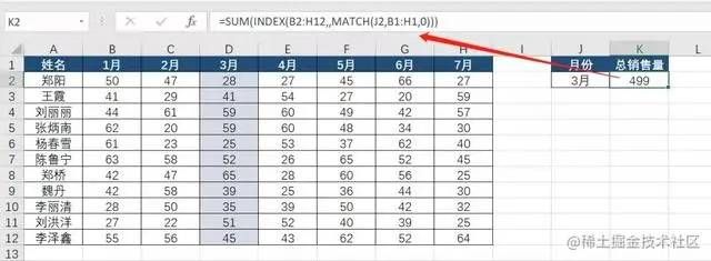 在单元格中输入公式=SUM(INDEX(B2:H12,,MATCH(J2,B1:H1,0)))。