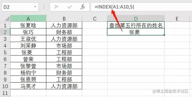 如图所示,需要查找第五行所在的姓名是谁,就可以直接输入公式=INDEX(A1:A10,5)即可获取结果。