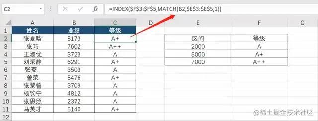 如图所示,业绩在2000到5000区间的等级为A,在5000到7000之间的为A+,而7000以上的则为A+++,这里在单元格中输入公式=INDEX(3:5,MATCH(B2,3:5,1)),向下填充。