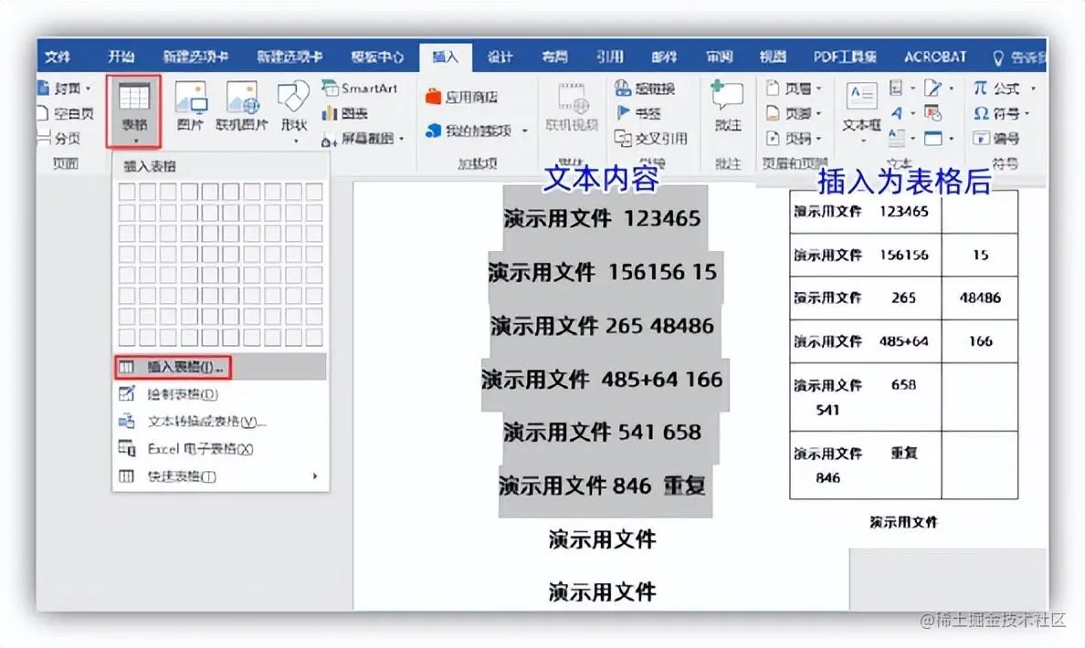 Word里面的数据还能转换成表格,将文本内容之间,用空格键分隔开,然后选中文字,点击工具栏的【插入】-【表格】-【插入表格】,就会自动转成表格。