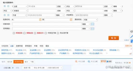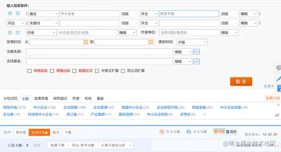 (3)第二步,如果第(2)步骤后的检索结果较少,可以设定检索式为:主题=中小企业 并含 转型升级,所得的论文确实变多了很多。但是若是精准检索得到的论文结果符合预期,这一步骤就不需要啦。