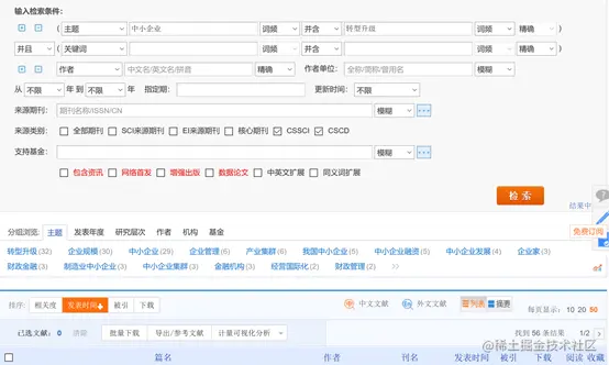 (1)第一步,需要设定检索词,比如此时我们需要切割检索词,可以分为“中小企业”和“转型升级”两个检索词。我们需要先尽可能的进行精准检索。
