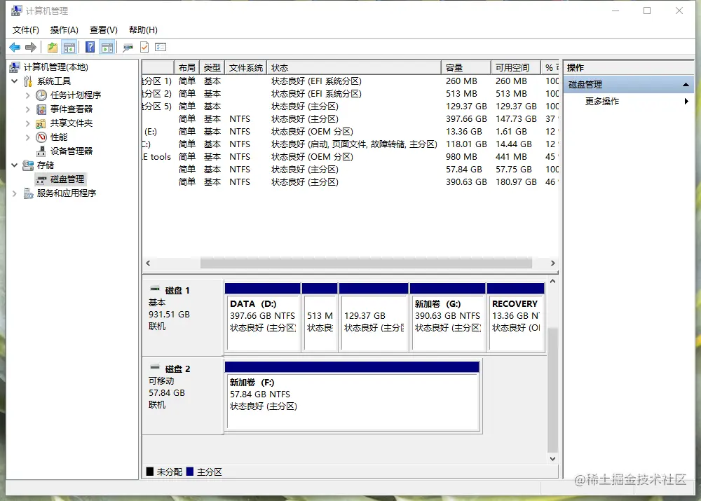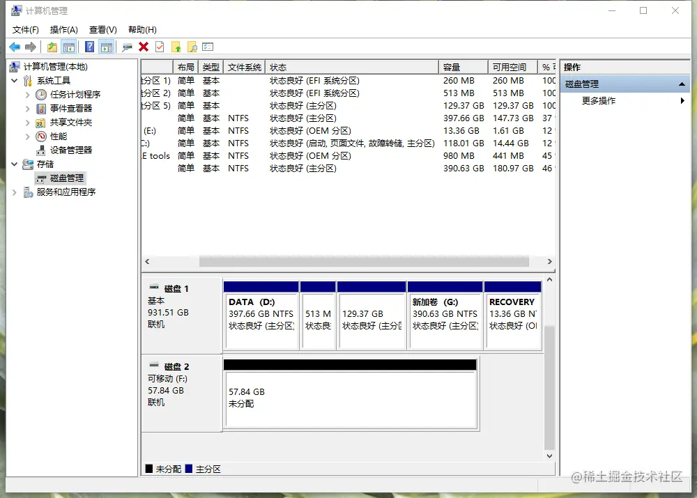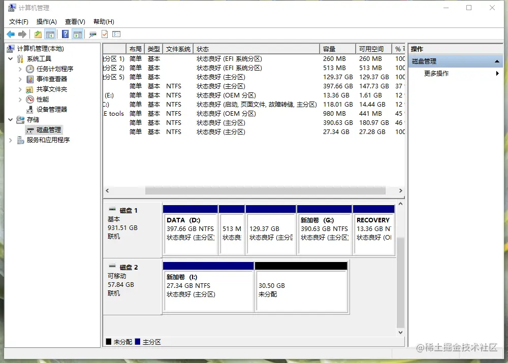 U盘做成系统盘后如何恢复成普通U盘? 睡觉谁叫 2023-05-10 383 阅读1分钟 第一步,在Windows系统下将U盘插入电脑。 第二步,右键点击“我的电脑”,选择“管理”,在“计算机管理”界面中选择左侧边栏中的“磁盘管理”。 打开后如下图所示: 可以看到磁盘二为我的U盘,其磁盘一半处于未分配状态,这使我的U盘容量少了一半。我们要恢复U盘的全部容量,首先要做的就是格式化已经分配的另一半,如下图所示,选中新加卷I,并点击左上方删除按钮。 结果如下图: 最后一步,选中未分配的磁盘,右键“新建简单卷”: 傻瓜式操作,一直下一步,直到完成: 最后U盘又回来啦!