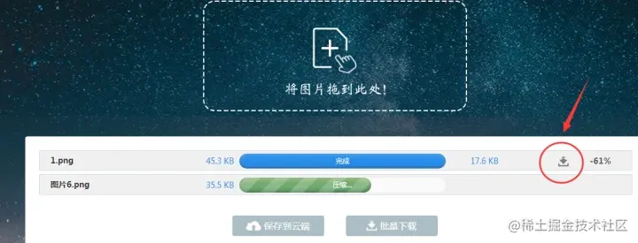 上传成功后会自动进行压缩,完成后页面会显示压缩后的图片大小,点击进度条后面的下载就可以了。