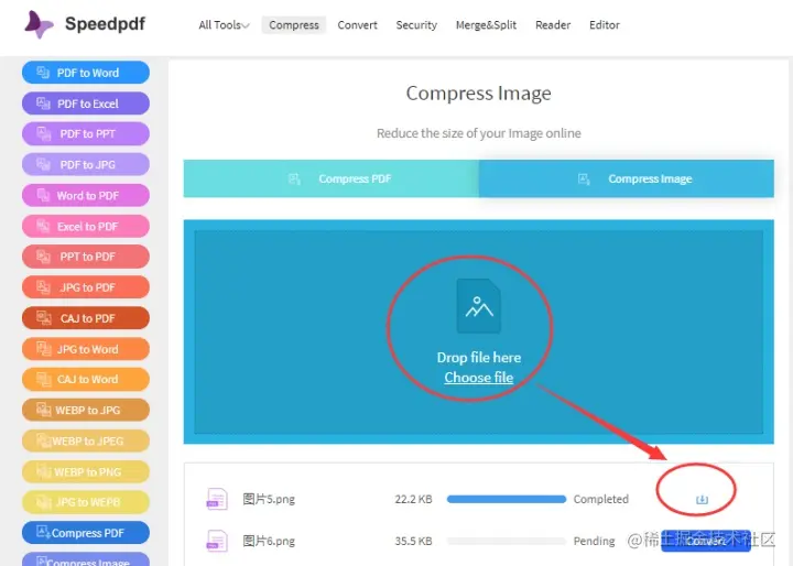 同样也是将图片直接拖拽到转换区域后,点击下方列表中图片文件进度条后convert开始压缩,完成后即可下载。
