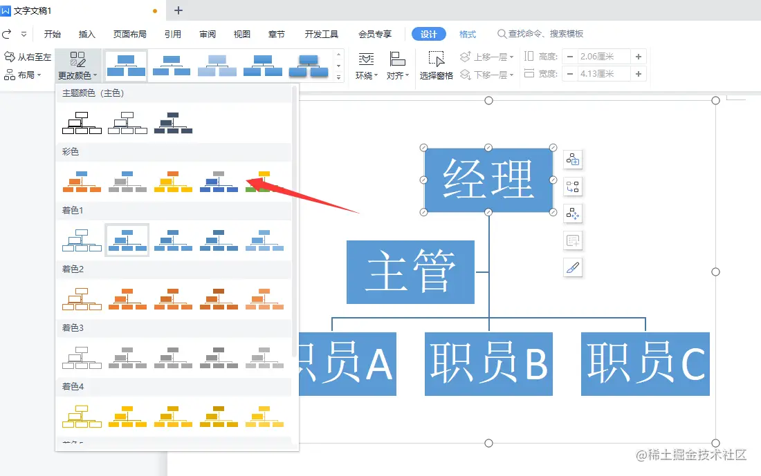 三、在设计选项卡找到“更改颜色”并点击打开,选择彩色,选择框体颜色;