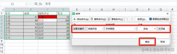 操作步骤跟第二种排序方式差不多,只不过在【排序依据】处选择【字体颜色】罢了。
