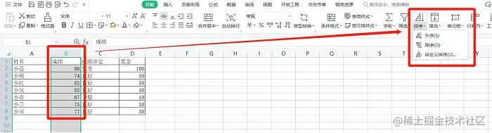 这种排序方式应该是比较常见而且常用的一种排序方式,打开excel表格,随意选中一个需要排序的数值,点击上方的【开始】,在工具栏的后面找到【排序】,即可根据数值进行升序或降序。
