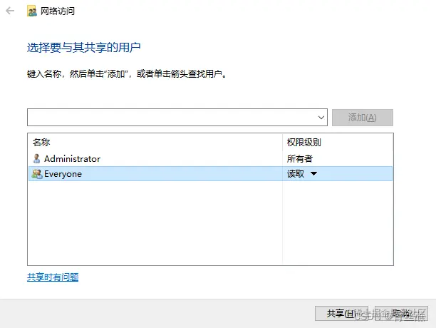 5.点击权限-》组或用户名中 添加Everyone或者guest,Everyone的权限勾选允许可读。