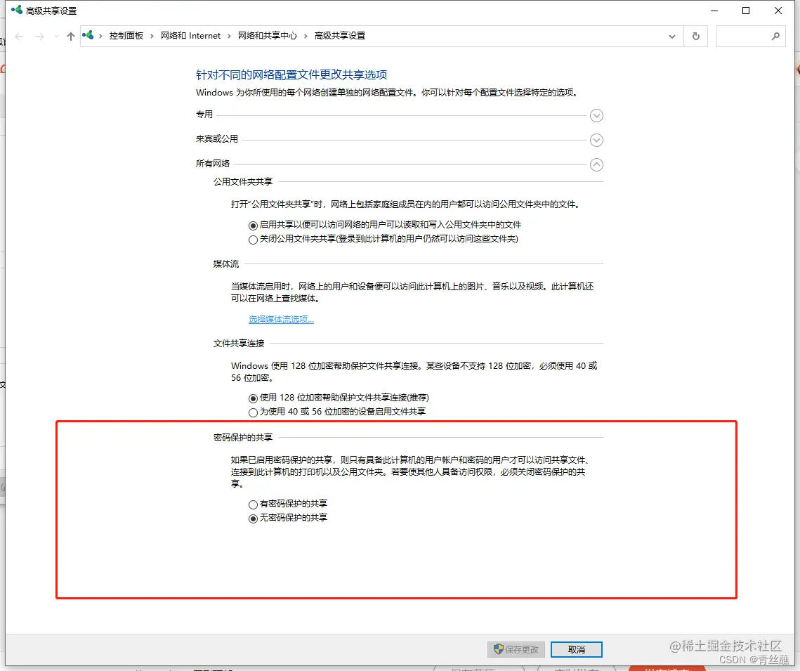 7.点击网络和共享中心,修改为勾选无密码保护的共享