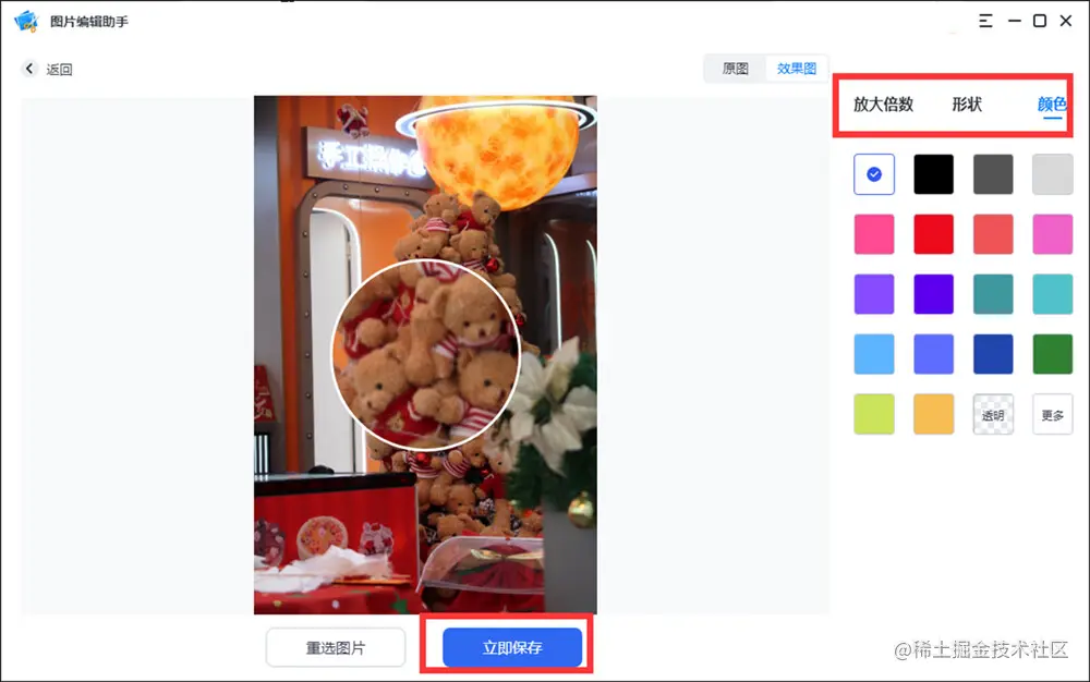 第三步 上传好图片文件之后即可进入到放大页面,点击选择放大镜的倍数以及放大镜的形状和大小。调整好之后,可以对其边框的颜色进行设置。编辑完成后的图片,点击下方的 【立即保存】 即可。